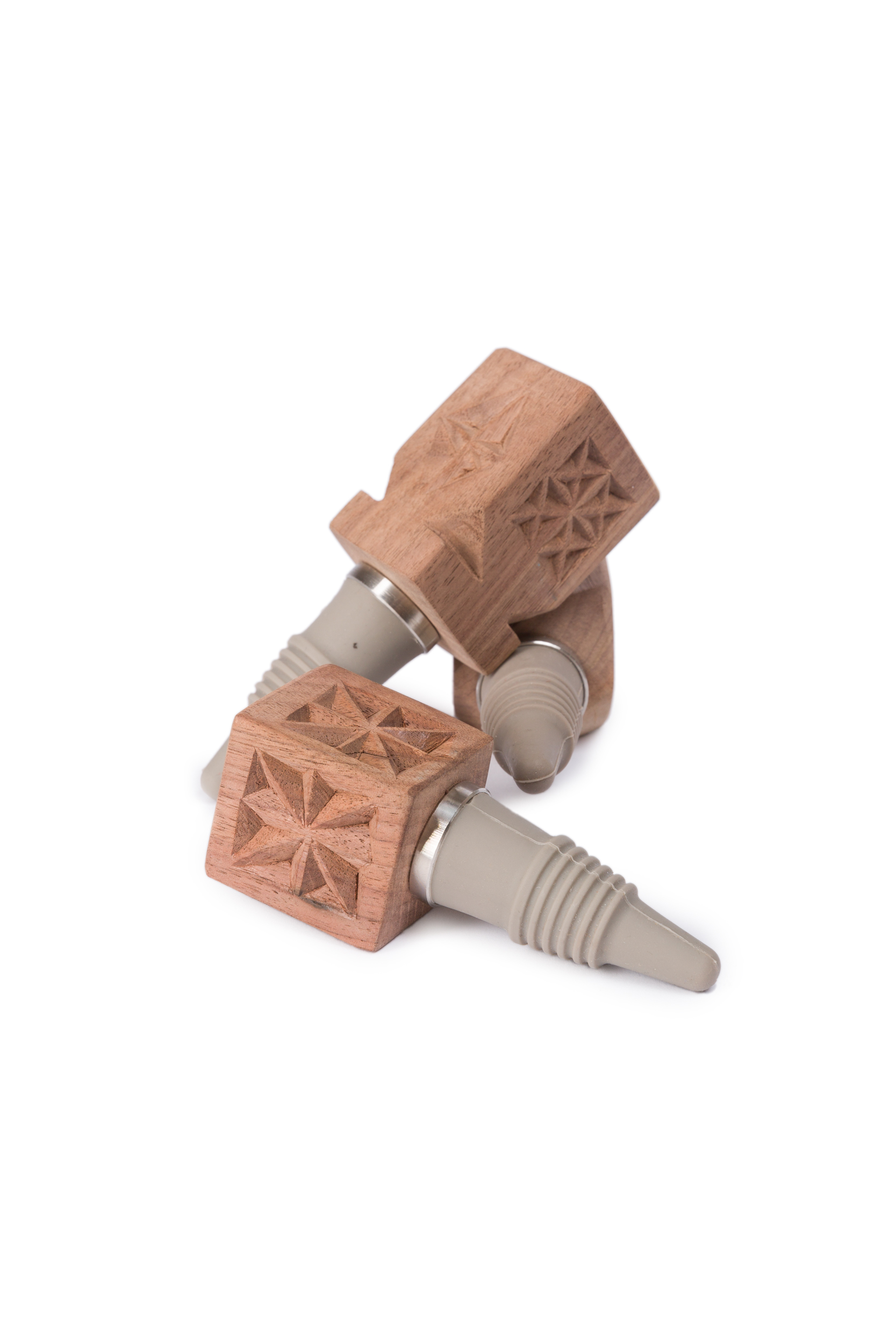 Fernández's hand-carved wine stoppers reuse wood from her past sculptures.